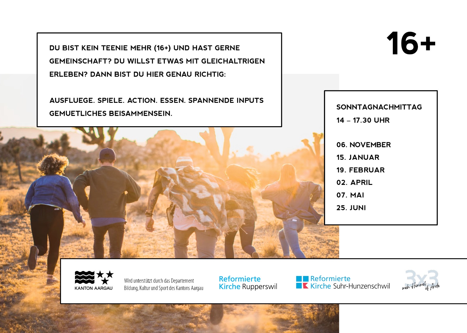 Zusammen mit Luca Villardita von der reformierten Kirche Rupperswil und Joel Ringgenberg von der reformierten Kirche Suhr-Hunzenschwil starten wir ein neues Gefäss für junge Leute (ca. 16+), die schon konfirmiert sind oder einfach die obligatorische Schulzeit hinter sich haben. Wir wollen ca. monatlich einen Ort schaffen, wo junge Leute der Region einen Platz für Gemeinschaft finden können, das ihrem Alter entspricht. Am 8. Januar starten wir das Ganze in der 3x3emk von 14 - 17:30 Uhr. Ziel des ersten Treffens ist es, uns alle besser kennenzulernen mit Apéro, Spiel & Spass, Brainstorming über das Programm des nächsten Semesters und das Suchen eines passenden Namens für dieses Projekt! Zum Schluss lassen mit den Nachmittag mit ein paar Pizzen ausklingen. Wir laden alle jungen Leute herzlich dazu ein, alleine oder gerade mit Freunden zu uns zu kommen!
